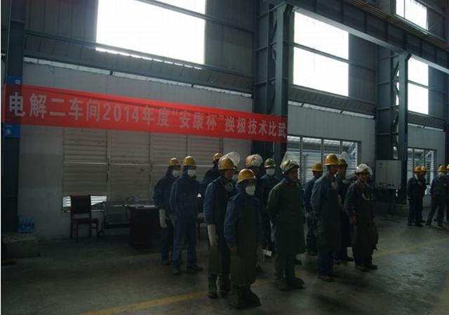 青海物產(chǎn)工業(yè)投資有限公司全面啟動(dòng)"安康杯"競(jìng)賽活動(dòng)。2014年4月15日上午電解二車(chē)間舉行了"安康杯"換極技術(shù)比武大賽。公司副總經(jīng)理張?jiān)手?,副總?jīng)理、工會(huì)主席張秉瑜,總經(jīng)理助理秦建峰出席了開(kāi)幕式。
