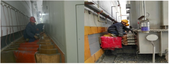 今年,對動力供電系統(tǒng)的濾油和檢修自2016年11月11日開始至2016年12月14日結(jié)束,歷時34天,在車間負責人的帶領(lǐng)下,運行各班組按照要求統(tǒng)一協(xié)作,以飽滿的工作熱情與低溫天氣和各種困難作斗爭,將工作重心圍繞在機組濾油和供電系統(tǒng)全面檢修上,他們有條不紊對計劃安排的整流柜銅母線螺栓、一次高壓開關(guān)和刀閘的瓷瓶、保護二次系統(tǒng)的端子排、控制柜進行全面清掃及螺絲緊固,對變壓器進行清洗,同時加強設(shè)備巡視,對濾波系統(tǒng)檢查出的刀閘操作機構(gòu)嚴重銹蝕,銅鋁過渡連接板開裂等進行了及時處理,認真進行消缺,保證了供電安全平穩(wěn)。